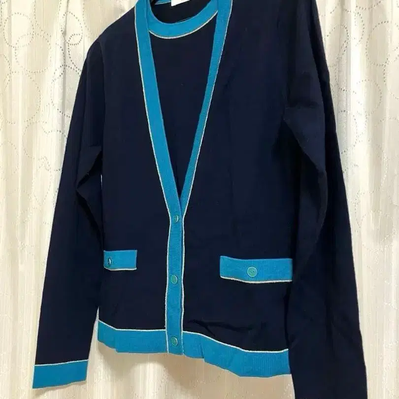 네이비와 터콰이즈의 배색, 라인에 은은한 골드가 들어 있습니다. 앙상블처럼 보이도록 디자인되었습니다. 이너와 가디건이 하나로 합쳐진 듯한 형태입니다.