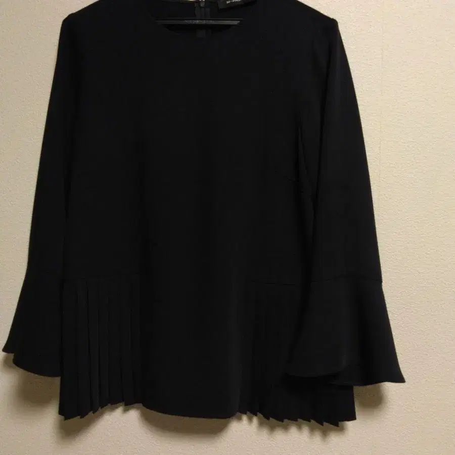 밑단 좌우에 플리츠 디자인으로 고급스러운 디자인이며, 7부 소매 블랙 상의.