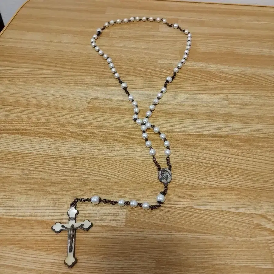 펄과 금속제 체인의 로자리오 목걸이, 십자가 포함. - 소재: 펄과 금속제 체인 - 디자인: 로자리오 스타일 - 색상: 화이트와 실버 - 특징: 십자가 펜던트 포함 방문해 주셔서 감사합니다.