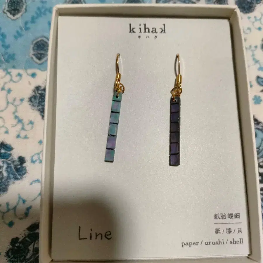 일본 종이와 옻칠을 사용한 그라데이션 디자인의 스트레이트 바 타입 귀걸이. - 브랜드: kihak - 모델명: Line - 소재: 일본 종이/옻칠/조개 - 색상: 그라데이션 (파랑, 그린, 보라색) - 디자인: 스트레이트 바 타입 방문해 주셔서 감사합니다. 귀걸이 형태 - 후크, 체인 한 번만 시착했습니다.