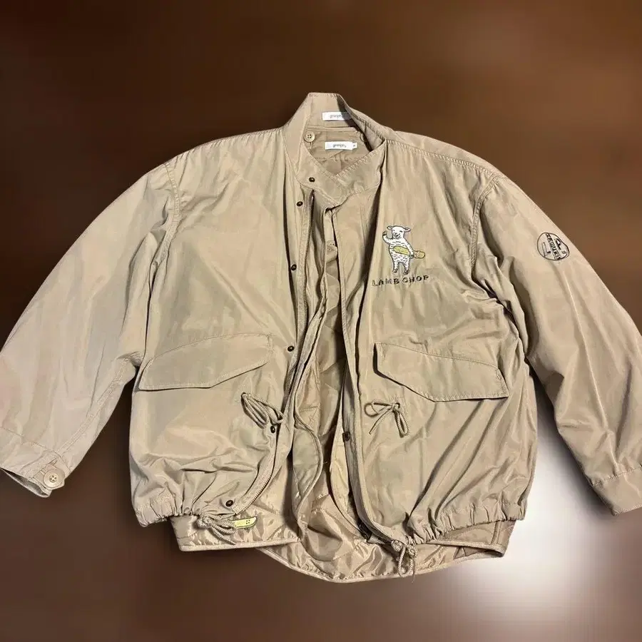 그라니프의 자수 양 캐릭터가 특징인 베이지색 아우터입니다.