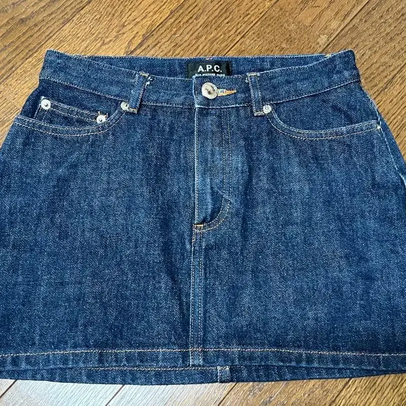다크 데님 소재의 A.P.C. 미니 스커트입니다. 프론트 버튼이 달린 심플한 디자인입니다.