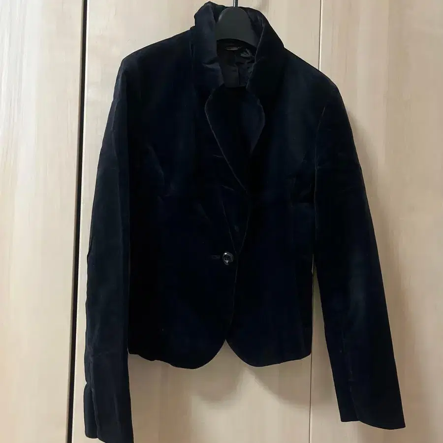 네이비 벨벳 소재의 테일러드 자켓, 원 버튼 디자인.