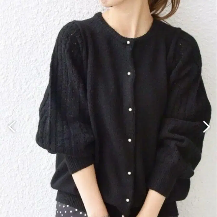 플라켓에 펄 라이크 버튼, 소매는 레이스 편직으로 한, 귀여운 디자인의 가디건.