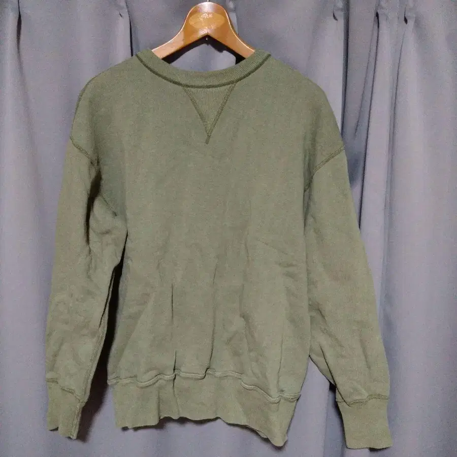 티셔츠가 울에서 면으로 바뀐 1930년대부터 있던 끼워넣기 사양의 허리 리브. 목 주위에는 신축성이 풍부한 V자 플라이스를 전후로 배치한 4본 바늘 사양의 맨투맨입니다. 어깨에서 수직으로 떨어지는 소매의 세트인 슬리브는 다소 솔리드한 인상을 주는 심플한 디자인이지만, 허리 오비의 바인더 사양은 입을수록 구김이 생깁니다.