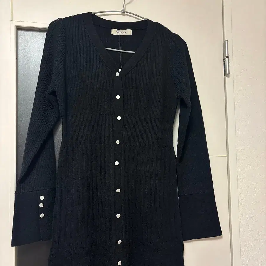 리브 편직 블랙 V넥 원피스, 펄 버튼 포함 - 색상: 블랙 - 디자인: 리브 편직 - 버튼: 펄 버튼 - 소매: 긴팔 - 스타일: V넥 - 슬릿: 위, 아래 버튼이 열립니다. 방문해 주셔서 감사합니다. 사이즈 - M