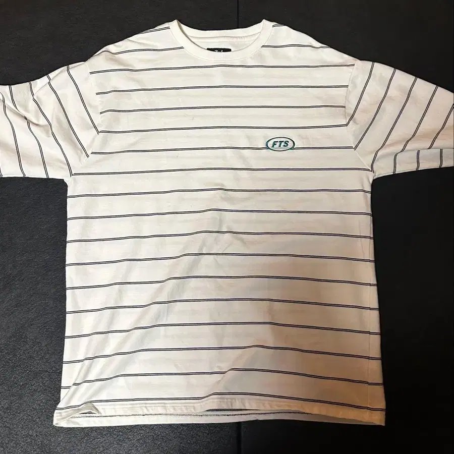 화이트와 네이비 스트라이프 디자인의 L 사이즈 긴팔 셔츠입니다.
