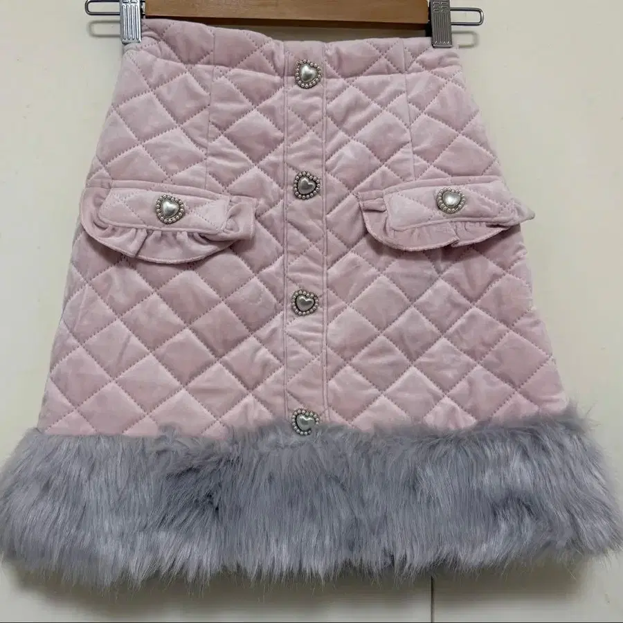 퍼가 달린 핑크 플레어 스커트, 스타일리시하고 따뜻한 디자인.