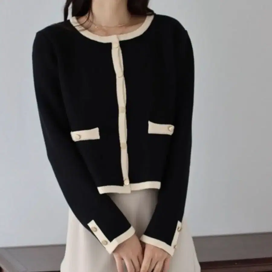 방문해 주셔서 감사합니다. 인터넷으로 구매한 후 착용하지 않고 보관했습니다. 택 포함 미사용 새상품입니다. - 색상: 블랙 - 디자인: 노카라, 버튼 부착, 포켓 부착 - 소재: 니트 사이즈 - M