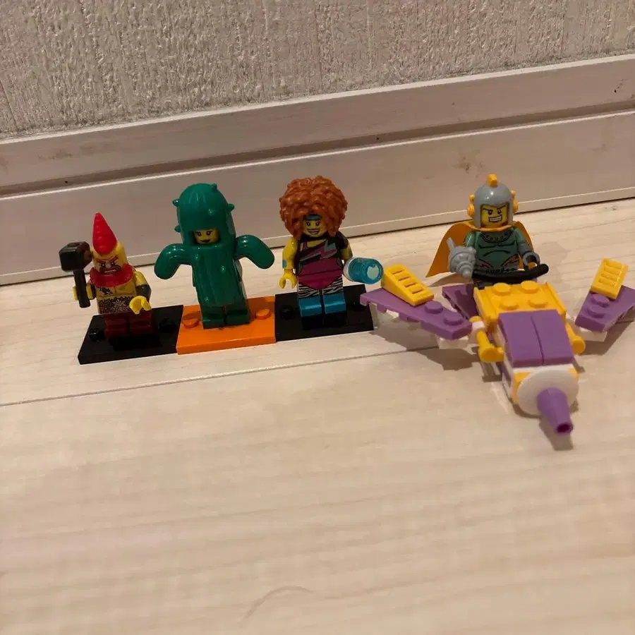 레고 미니피규어 4체와 보라색 탈것 세트. - 캐릭터: 레고 미니피규어 4체 (빨간 모자 캐릭터, 선인장 캐릭터, 금발 캐릭터, 기사 캐릭터) - 세트 내용: 레고 미니피규어 4체와 탈것 - 탈것 색상: 보라색과 노란색 - 탈것 특징: 앞쪽에 노즐이 있는 디자인 방문해 주셔서 감사합니다.