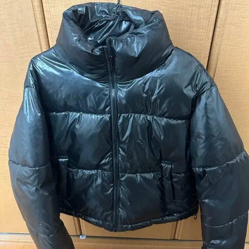 광택이 나는 블랙 숏 기장 다운 자켓, 스탠드 카라와 프론트 지퍼 포함. - 색상: 블랙 - 디자인: 광택 있는 소재 - 스타일: 숏 기장 - 옷깃: 스탠드 카라 - 지퍼: 프론트 지퍼 방문해 주셔서 감사합니다.