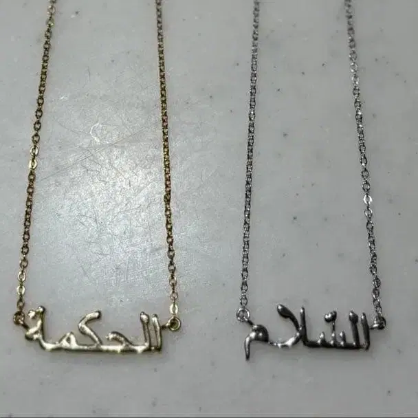 아랍어 문자가 새겨진 골드와 실버 목걸이. 2가지 색상으로 출시되며, 길이 조절이 가능합니다.