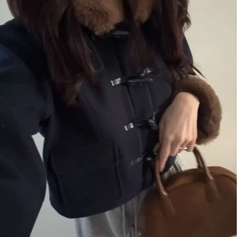 촬영 시에만 착용. 울과 퍼를 사용한 네이비 색상의 더플 코트 스타일 크롭 자켓. - 색상: 네이비 - 소재: 울, 퍼 - 디자인: 더플 코트 스타일 - 특징: 후드 부착, 단추식 - 사이즈: 크롭 기장 방문해 주셔서 감사합니다.