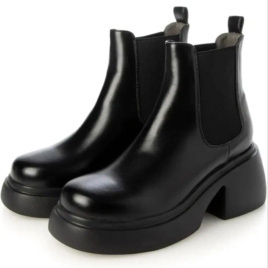 합성 피혁 소재의 스타일리시한 사이드 고어 부츠, 와이드 힐로 안정감이 있습니다.