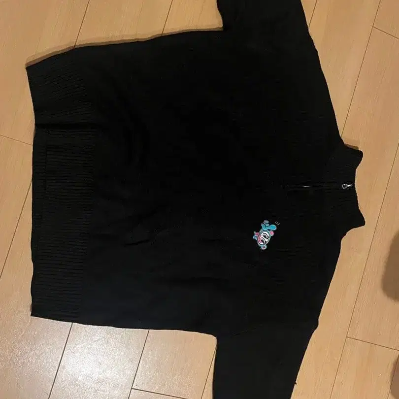엔젤 블루 집업 디자인의 블랙 긴팔 니트 목 부분은 지퍼를 끝까지 올릴 수 있습니다! 길이는 155cm로 엉덩이를 덮는 정도의 길이입니다! 한 번도 입지 않아서 보풀도 생기지 않았고 깨끗합니다.