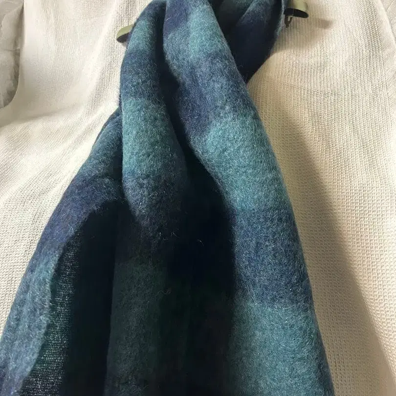 청록색과 네이비 체크 무늬의 울 소재 머플러입니다. 모헤어도 포함된 것 같지만, 가볍고 부드러운 소재입니다.