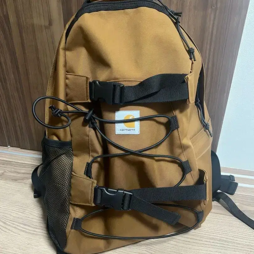 내구성이 뛰어난 나일론 소재에 메쉬 포켓이 달린 브라운 백팩.