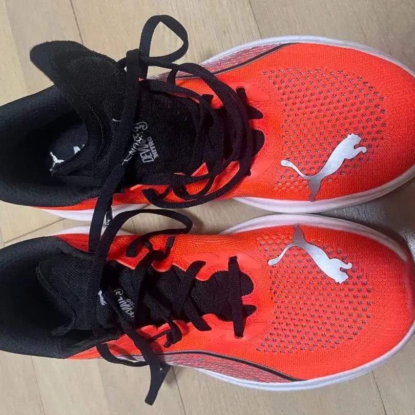 메쉬 어퍼와 팜 플레이트 밑창의 러닝화, 경량성과 통기성이 뛰어난 디자인. - 브랜드: Puma - 색상: 오렌지 - 디자인: 메쉬 어퍼 - 밑창 타입: 팜 플레이트 - 용도: 러닝 방문해 주셔서 감사합니다. 제 달리기 실력에는 맞지 않아 판매하게 되었습니다. 2회 정도 착용했습니다.