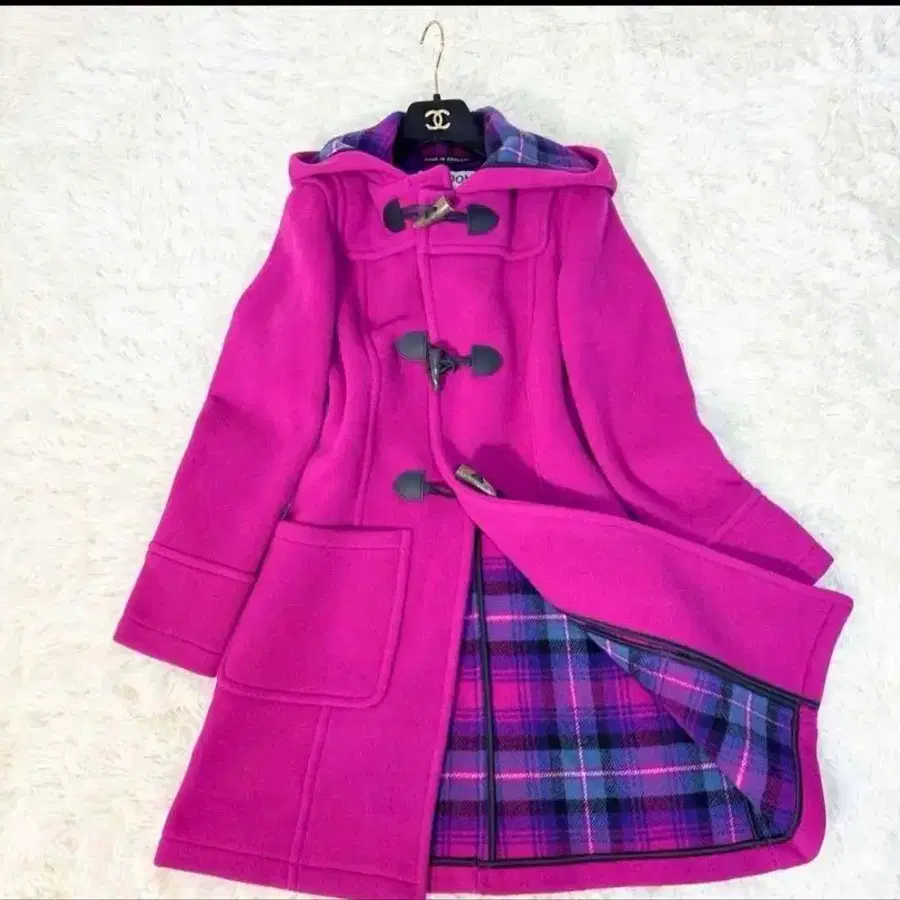퍼플 울 혼방 더플 코트, 체크 무늬 안감 부착으로 스타일리시합니다.