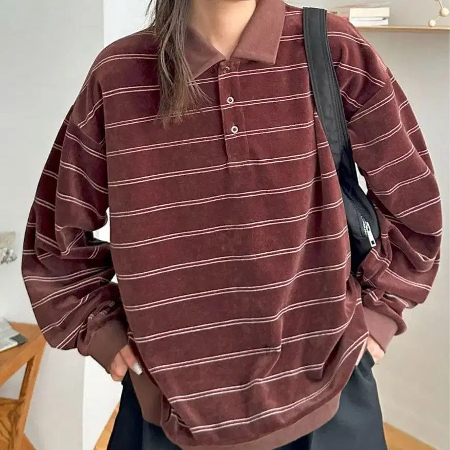 모카 브라운 보더 디자인 벨로아 긴팔 피케 셔츠