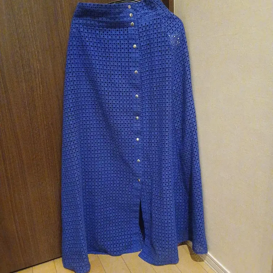 레이스 느낌의 파란색 플레어 스커트, 버튼 디자인. - 색상: 파랑 - 디자인: 버튼 포함 - 소재: 레이스 느낌의 원단 방문해 주셔서 감사합니다.