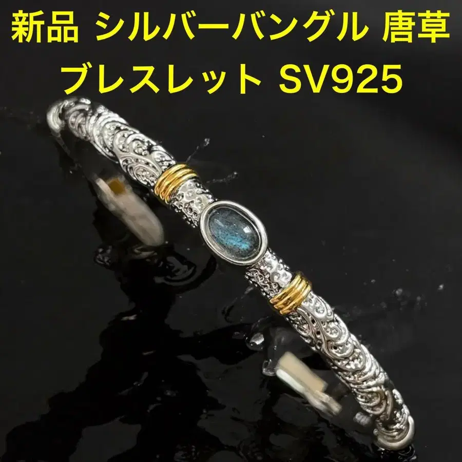 당초 무늬와 골드 컬러 악센트, 블루 스톤이 특징인 실버 뱅글입니다 ☆ 상태: 새상품 소재: SV925 사이즈: FREE