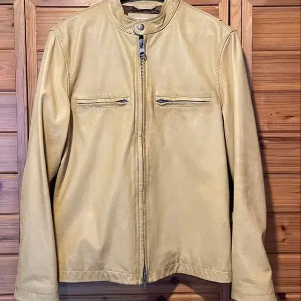 베이지 색상의 심플한 라이더 가죽 자켓.