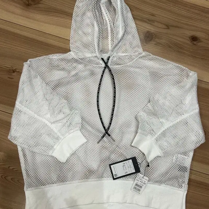 메쉬 소재의 화이트 후드티로, 소매는 7부 기장입니다.
