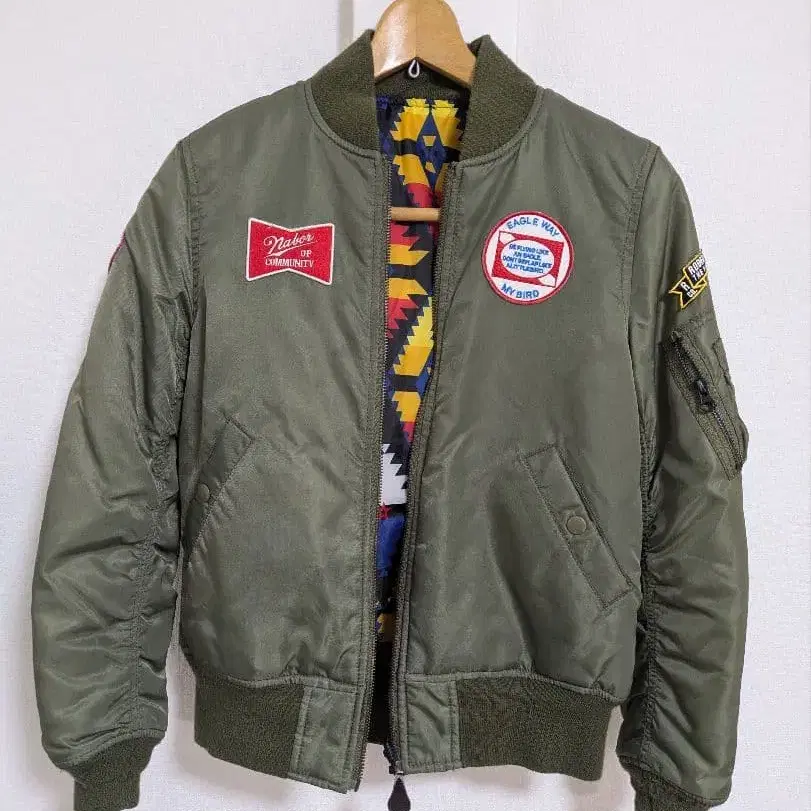 올리브 색상의 MA-1 자켓, 기하학 패턴 안감과 패치가 달린 디자인. - 색상: 올리브 - 디자인: 패치 부착 - 안감: 기하학 패턴 - 스타일: MA-1 - 소매: 지퍼 포켓 부착 방문해 주셔서 감사합니다. 옷 취향이 바뀌어서 판매합니다. 상품은 간편 포장하여 보내드립니다. 이미지 색상은 사용하시는 브라우저나 설정, 단말기에 따라 실물과 다를 수 있다는 점 미리 양해 부탁드립니다. 자택 보관, 개인 검품이므로 이해해 주시는 분의 구매 부탁드립니다. 판매되지 않으면 조금씩 할인해 갈 예정이니 편하게 상담해주세요!