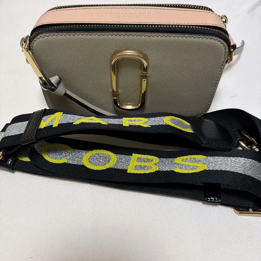 지퍼가 달린 베이지와 핑크 색상의 숄더백, 로고가 새겨진 스트랩 포함.