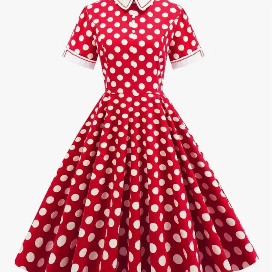 빨간색 도트 무늬의 A라인 원피스, 반팔과 하얀 옷깃이 특징입니다.