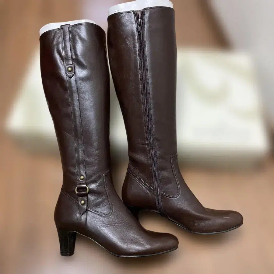 자동 번역되었어요. 원문보기다크 브라운 색상의 가죽 소재, 지퍼가 달린 롱 부츠입니다.