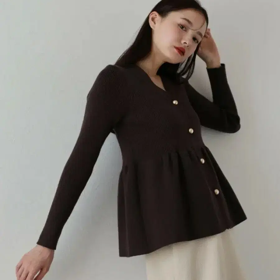 페플럼 디자인과 금 버튼이 악센트가 되는 니트 가디건.