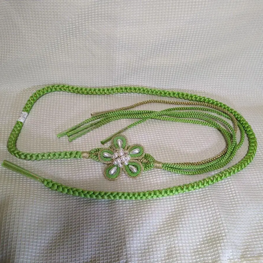 후리소데용 순수 실크 허리띠입니다. 옐로우 그린 색상의 바탕으로 만들어진 끈이며, 펄을 중심으로 장식 끈으로 꽃이 만들어져 귀엽습니다. 길이: 약 160cm 소재: 실크 잘 부탁드립니다.