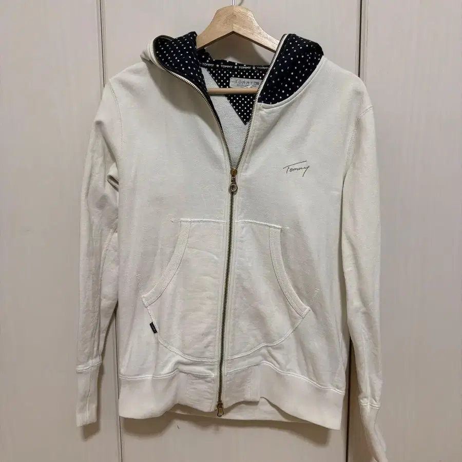 도트 무늬 후드 부착 집업 후드티. - 브랜드: Tommy - 색상: 화이트 - 디자인: 도트 무늬 후드 - 텍스트: NEWYORKCITY, EST.1985 - 스타일: 집업 S 사이즈 남녀 공용입니다!