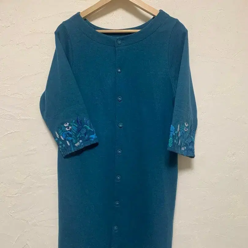 플라워 자수가 들어간 파란색 7부 소매 원피스. - 색상: 그린에 가까운 파랑 - 소매 길이: 7부 소매 - 자수 디자인: 플라워 자수 - 앞뒤 2웨이 구제 의류이므로 이해 부탁드립니다. 어깨 너비 36cm 가슴 너비 46cm 밑단 폭 60cm 기장 88cm 소매 길이 43cm (개인 측정) 방문해 주셔서 감사합니다.