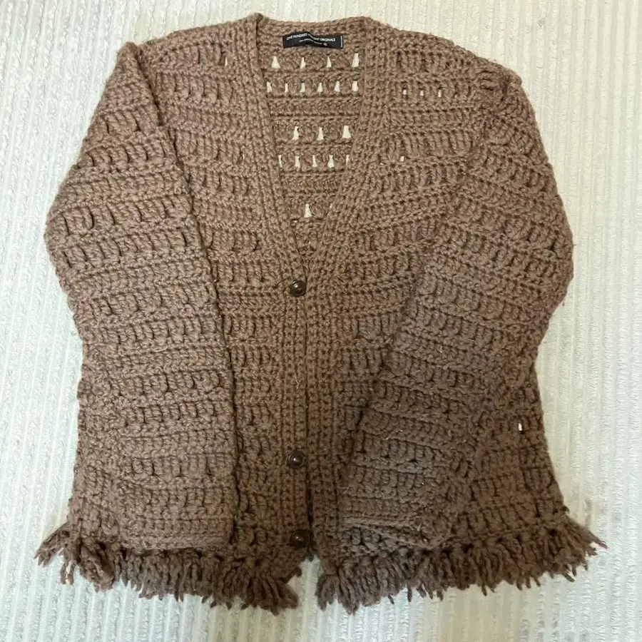 자동 번역되었어요. 원문보기프릭스스토어 브라운 니트 가디건, 버튼 포함, 프린지 디자인.