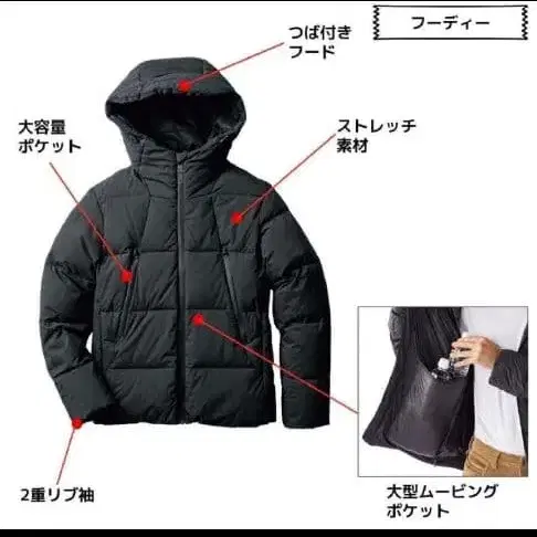 세탁 가능한 다운 소재를 사용한 후드 부착 자켓, 스트레치성과 대용량 포켓이 특징. 방문해 주셔서 감사합니다.