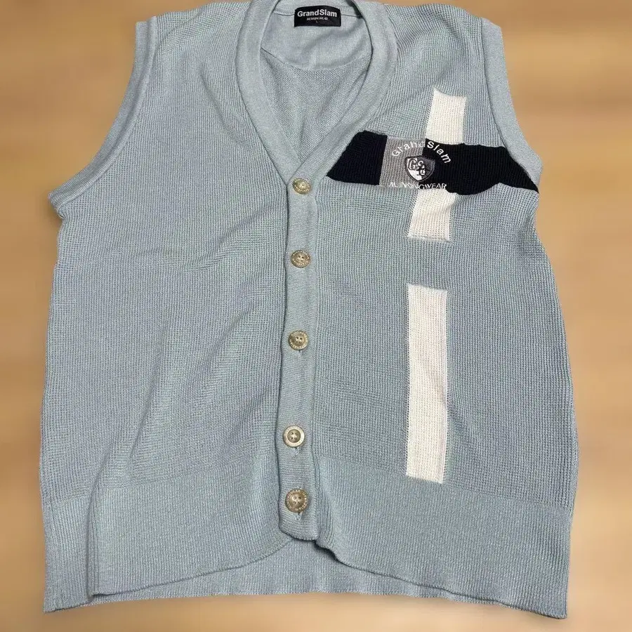 리브 니트 라이트 블루 베스트, 포켓과 로고 자수 있음.
