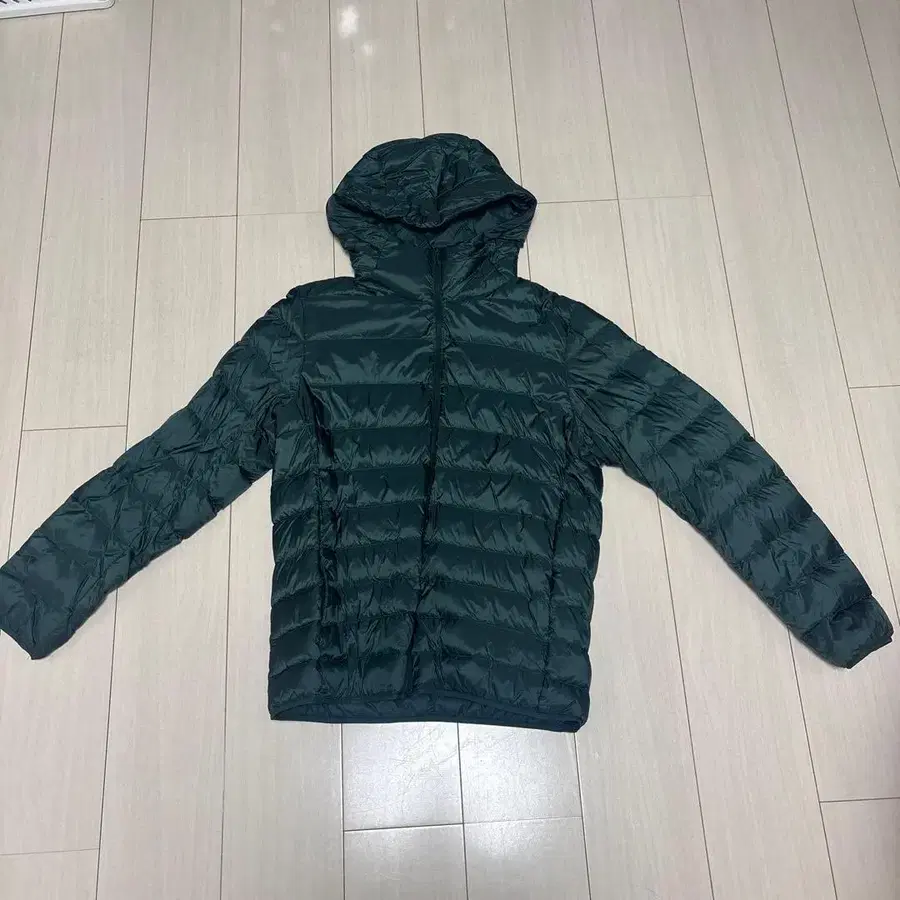 다크 그린 후드 부착 다운 자켓