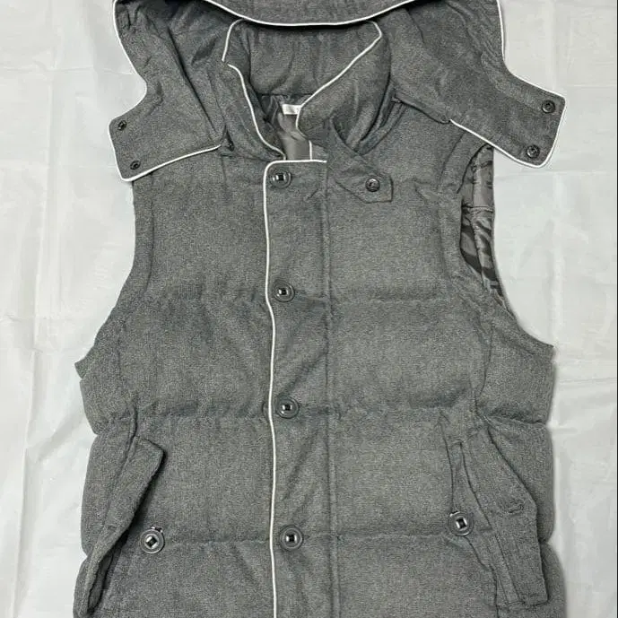 다운풍 소재의 그레이 색상 베스트, 탈부착 가능한 후드가 달려 있으며, 사이드 포켓도 완비.