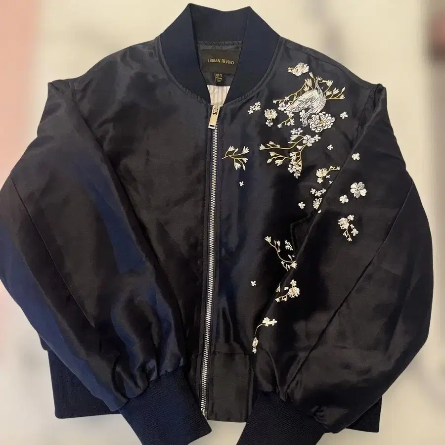 네이비 색상의 새틴 소재에 꽃과 학 자수가 놓인 스카잔. - 브랜드: URBAN REVIVO - 색상: 네이비 - 디자인: 자수 포함 - 스타일: 스카잔 - 소재: 새틴 - 특징: 프론트 지퍼 - 장식: 꽃과 물고기 자수 방문해 주셔서 감사합니다.