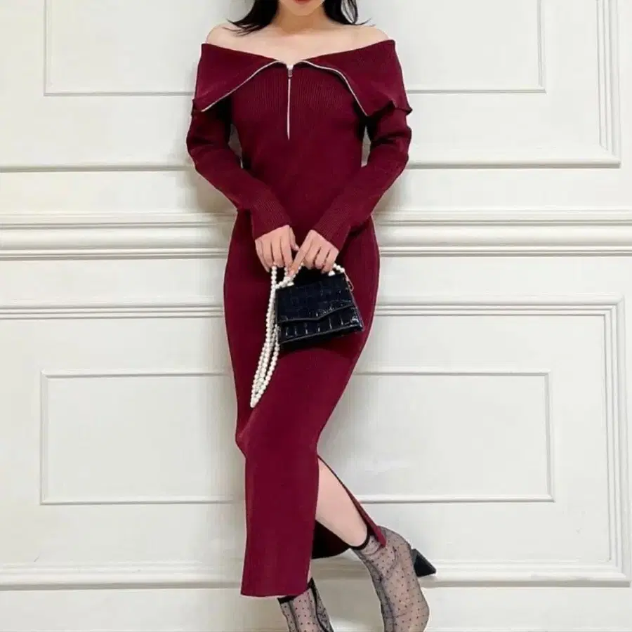 큰 옷깃으로 내추럴한 느낌을 살린 하프 지퍼 니트 원피스.