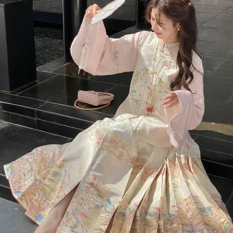 전통 의상 마면군 바멘 스커트 크림색 꽃무늬 누각 무늬 성인식 기모노