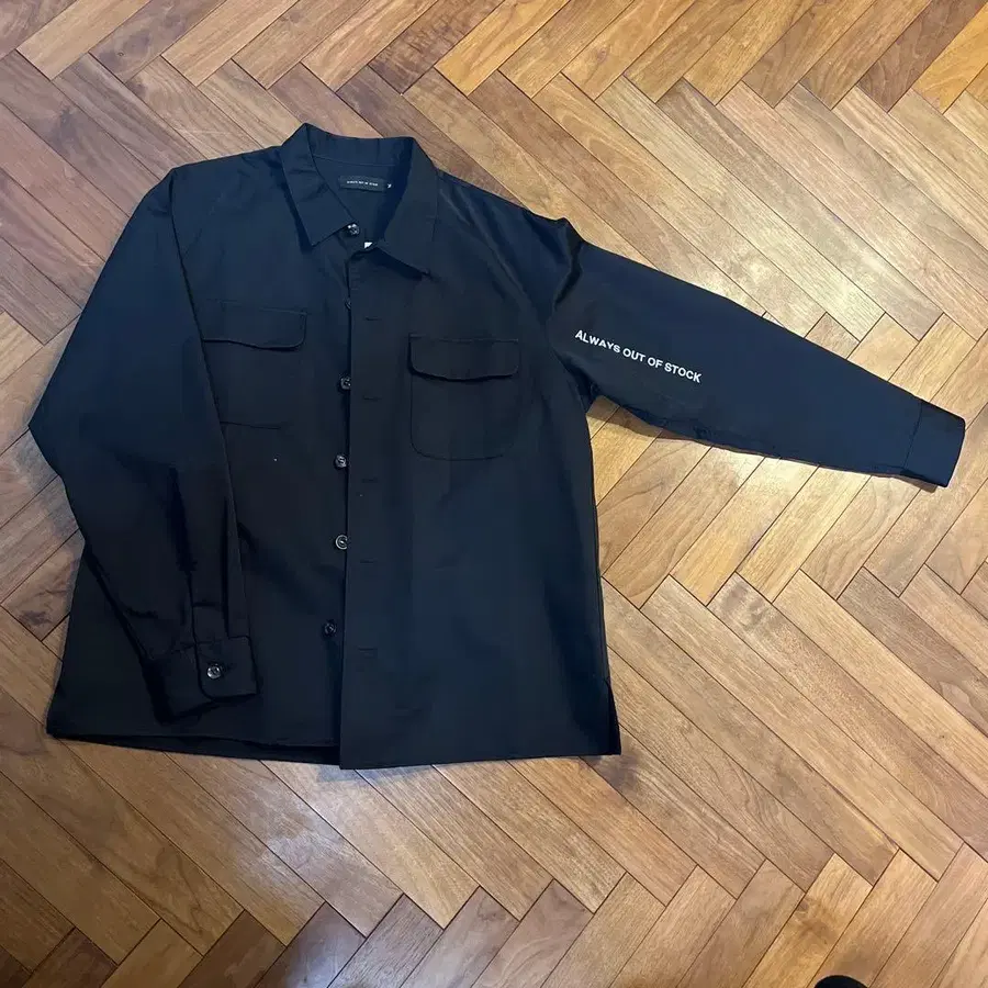 캐주얼한 블랙 긴팔 셔츠, 왼쪽 소매에 [ ALWAYS OUT OF STOCK ] 프린트.