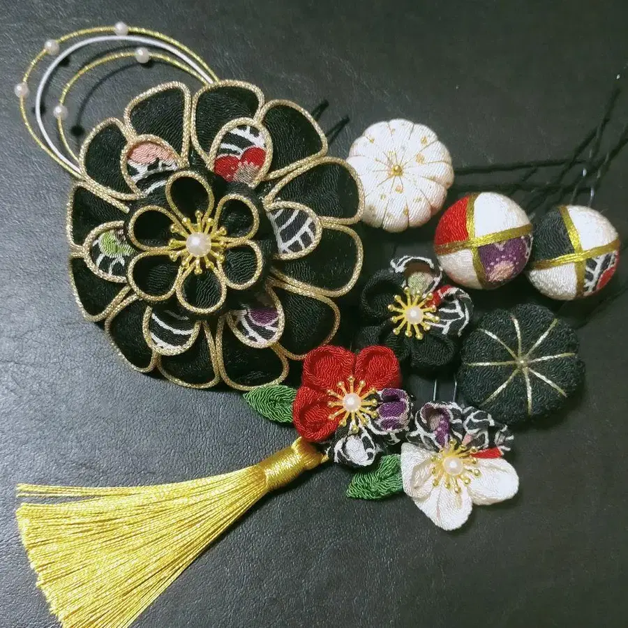 핸드메이드 일본 의류용 머리 장식입니다. 블랙과 빨간색 꽃 모티브에 골드 컬러 태슬이 특징인 일본풍 머리 장식. 프로필도 보시고 검토해 주세요. #성인식 #졸업식 #시치고산 #핸드메이드 #아이보리 #블랙 #빨간색 #구슬장식 #구슬헤어콤 #유카타 #후리소데 #하카마