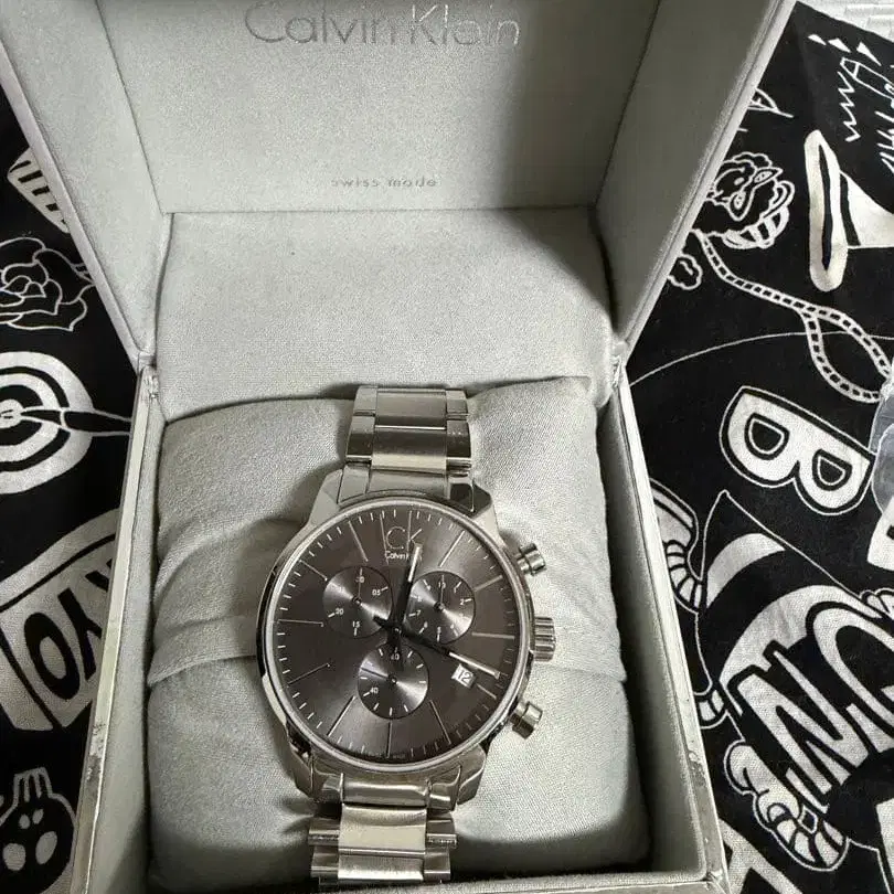 스테인리스 스틸 소재의 그레이 크로노그래프 시계, Calvin Klein 박스 포함. - 브랜드: Calvin Klein - 색상: 그레이 배터리 교체는 하지 않았습니다. 사용감이 있으므로 신경 쓰이는 분은 구매를 자제해주세요!!! 방문해 주셔서 감사합니다.