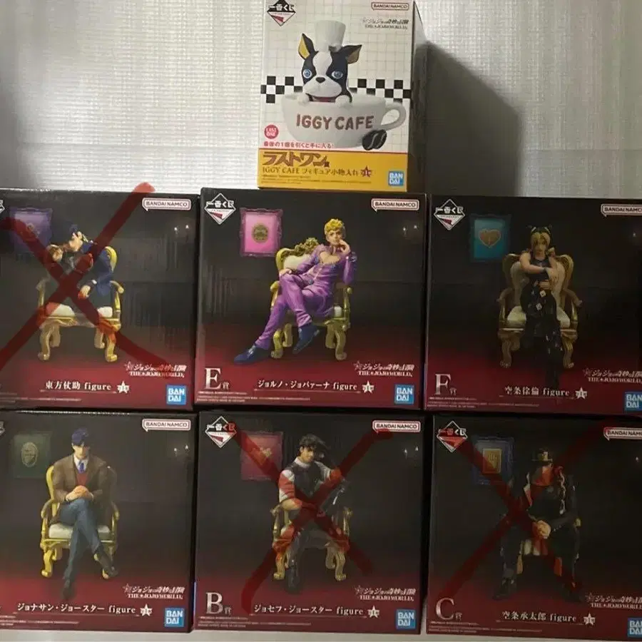 제일복권 죠죠의 기묘한 모험 THE*JOJO WORLD A상 조나단 죠스타 E상 죠르노 죠바나 figure F상 쿠죠 죠린 figure 라스트 원상 IGGY CAFE 피규어 소품함 미개봉입니다. 가격 인하 불가