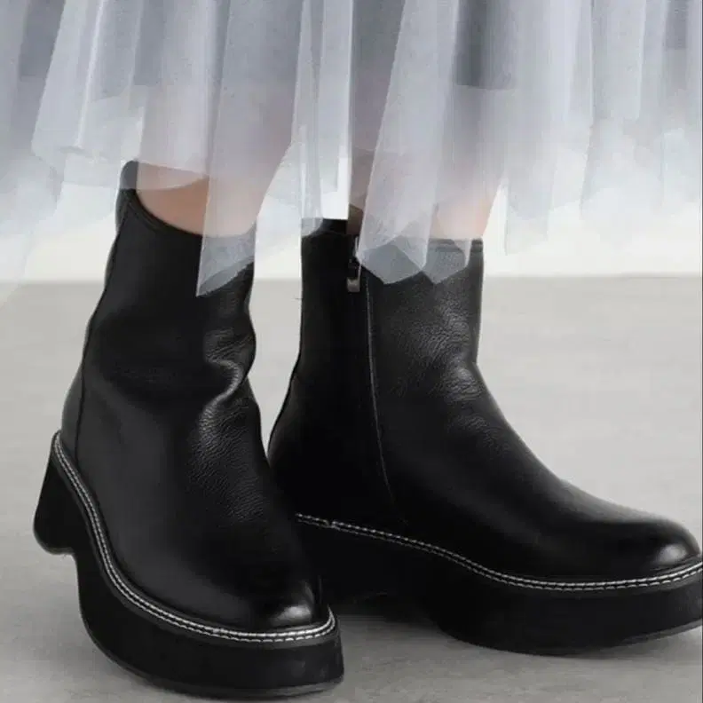 둥근 앞코 디자인과 통굽이 볼륨감을 더하는 부츠.