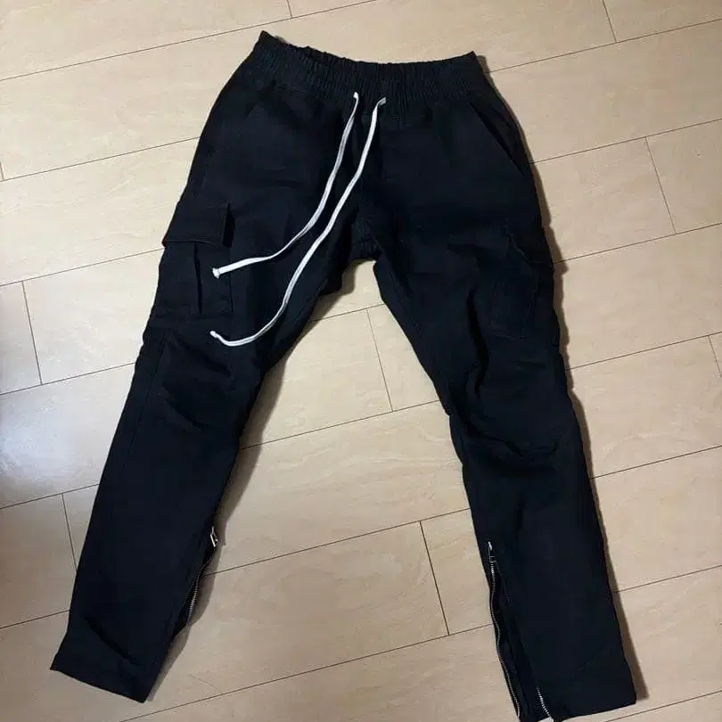 지퍼 포켓과 드로우 스트링이 달린 블랙 카고 팬츠입니다.
